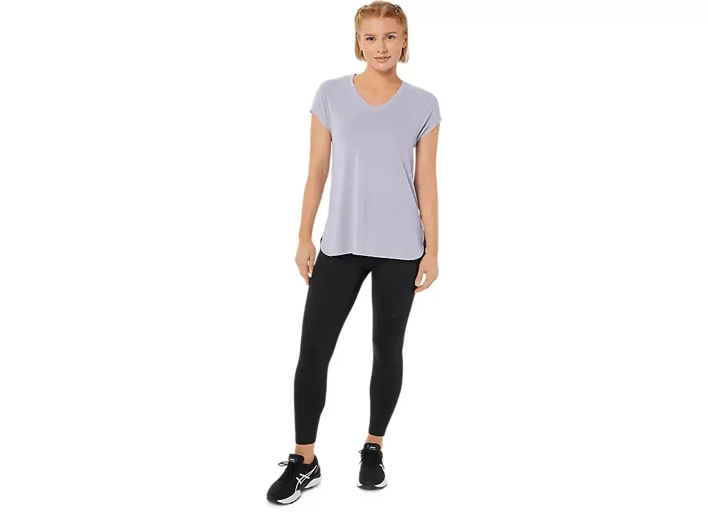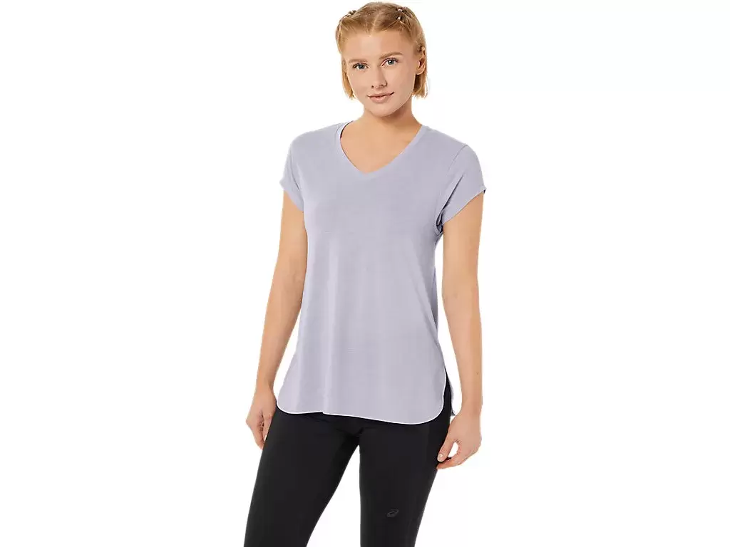 Ta bluzka z krótkim rękawem i dekoltem w serek została zaprojektowana tak, aby zapewnić uczucie gładkości i komfortu. Wykonana jest z wygodnej dzianiny, a jej boczne szwy z przodu zapewniają swobodę ruchów.