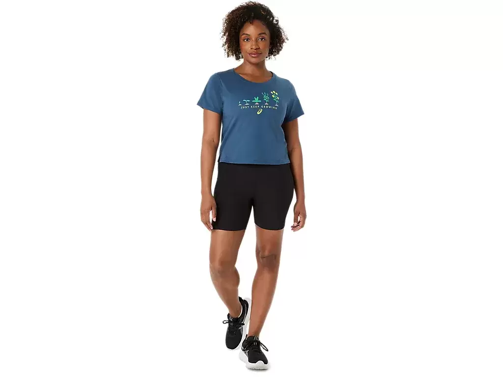 Ta wygodna dzianinowa koszulka z krótkim rękawem ozdobiona jest z przodu serią grafik roślinnych na różnych etapach cyklu wzrostu. Pod spodem widnieje również napis „JUST KEEP GROWING”.