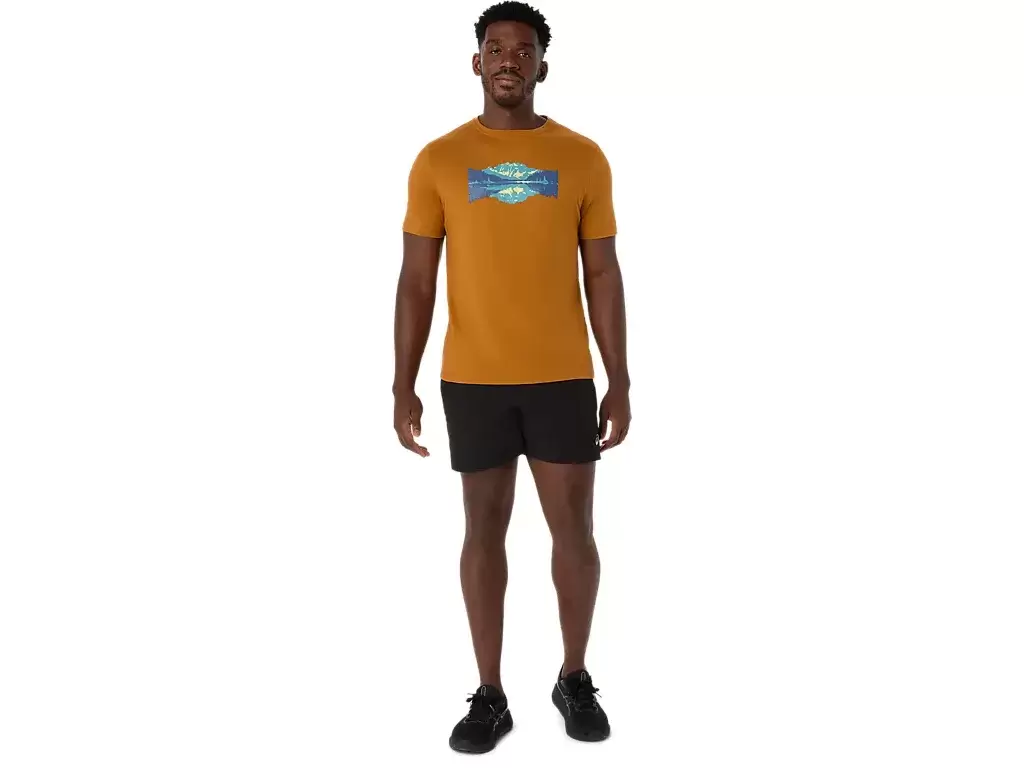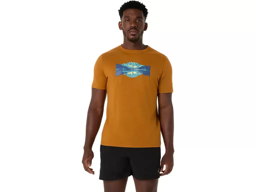 Ta wygodna dzianinowa koszulka z krótkim rękawem czerpie inspirację z natury. Grafika z przodu przedstawia spokojne jezioro na tle górskich szczytów.