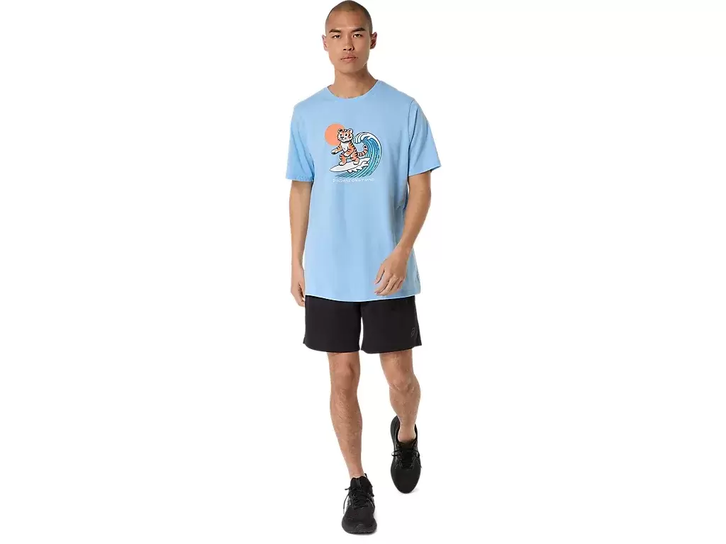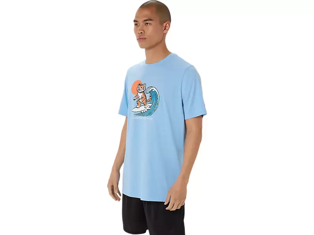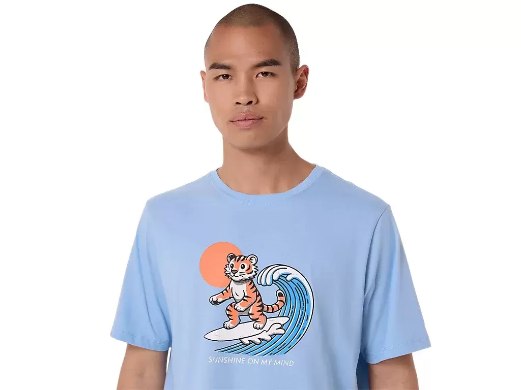 Ta wygodna dzianinowa koszulka z krótkim rękawem czerpie inspirację z plaży. Przód przedstawia surfującego tygrysa, a pod spodem widnieje napis „SUNSHINE ON MY MIND”.