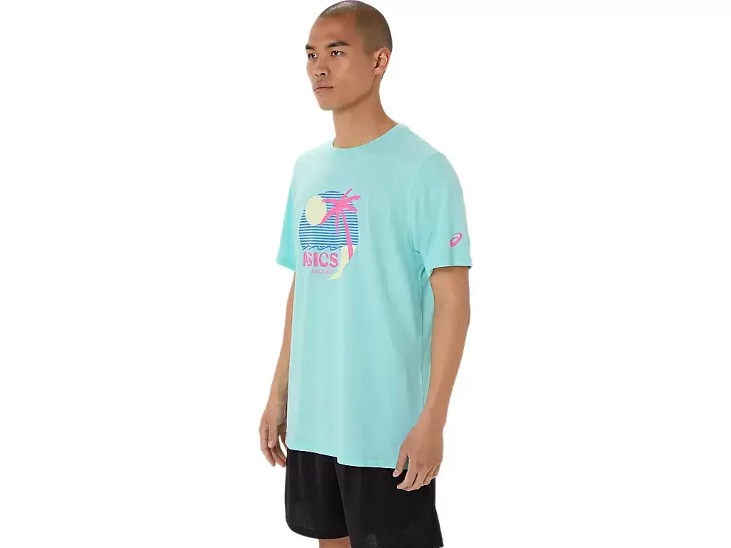 Ta wygodna dzianinowa koszulka z krótkim rękawem czerpie inspirację ze słonecznych plaż. Grafika z przodu przedstawia różnorodne nadmorskie elementy, uzupełnione żywymi kolorami.